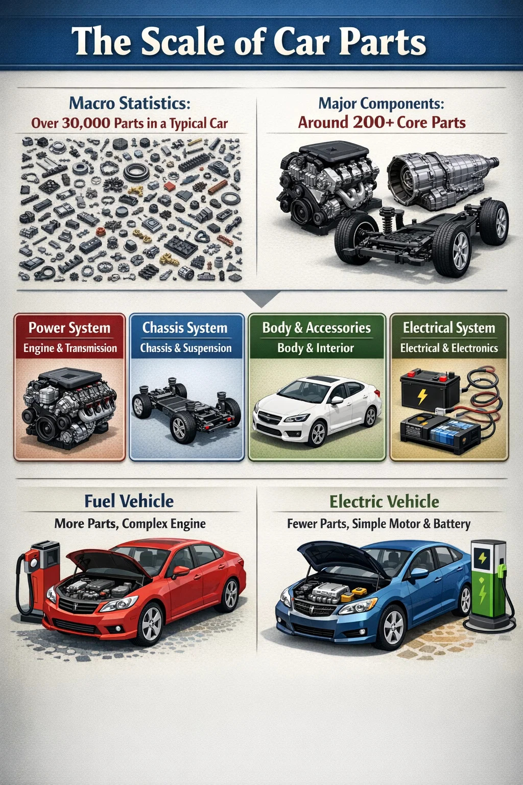 Bakış açımızı değiştirirsek ve motor, şanzıman ve şasi gibi karmaşık mekanik aksamları tek bir ünite olarak düşünürsek, bir otomobilin yaklaşık birkaç yüz temel ana bileşenden oluştuğunu görürüz. Bu sınıflandırma genellikle tamirhanelerde duyduğumuz sınıflandırmaya daha yakındır.