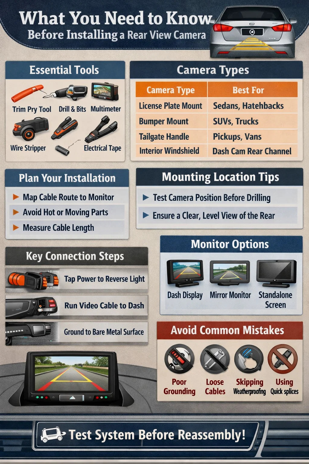Bir araca arka görüş kamerası takmak, çoğu araç sahibinin kolayca tamamlayabileceği basit bir Kendin Yap projesidir. 1 ila 2 saat temel araçlarla. Temel süreç, kameranın aracın arkasına monte edilmesini, güç ve video kablolarının iç mekandan geçirilmesini ve her şeyin bir ekran monitörüne bağlanmasını içeriyor. İster sedan, SUV, kamyonet veya hatchback üzerinde çalışıyor olun, temel adımlar tutarlı kalır; ancak kablo yönlendirme mesafeleri ve montaj zorlukları araç türüne göre değişir.