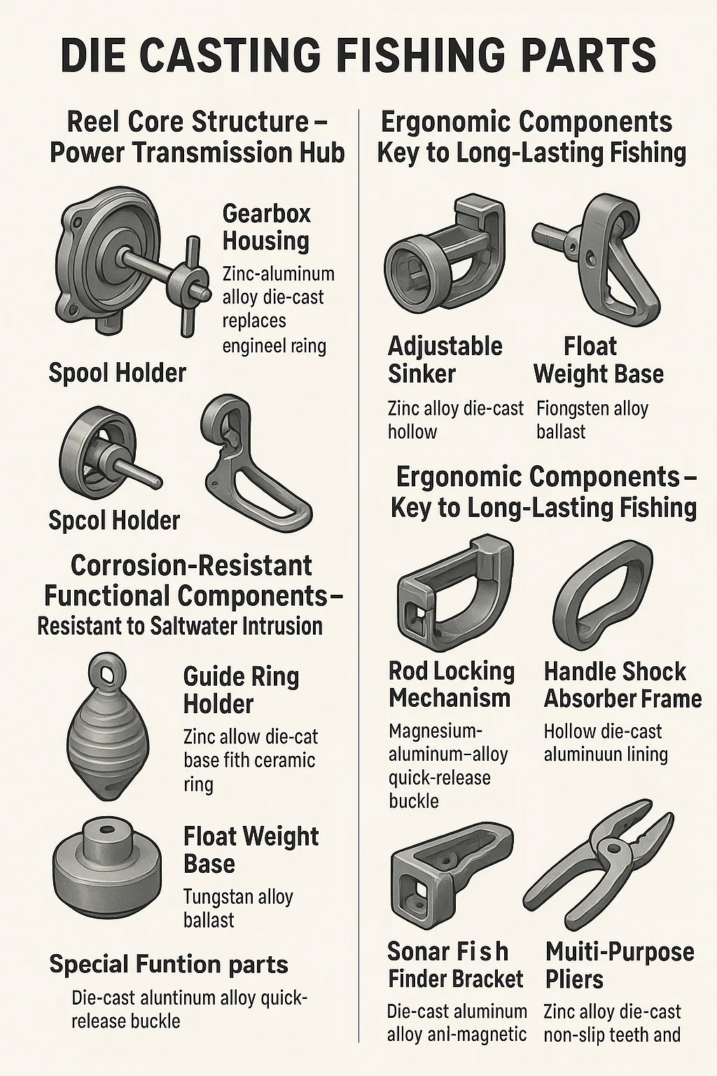 Ölüm Döküm Balıkçılık Parçaları yüksek basınçlı döküm işlemi kullanılarak üretilen çekirdek metal bileşenlerdir. Hafiflik, korozyon direnci ve fonksiyonel güvenilirlik gibi kilit balıkçılık mücadele gereksinimlerini ele alırlar. Temel uygulamalar ve özellikler aşağıdaki gibidir: