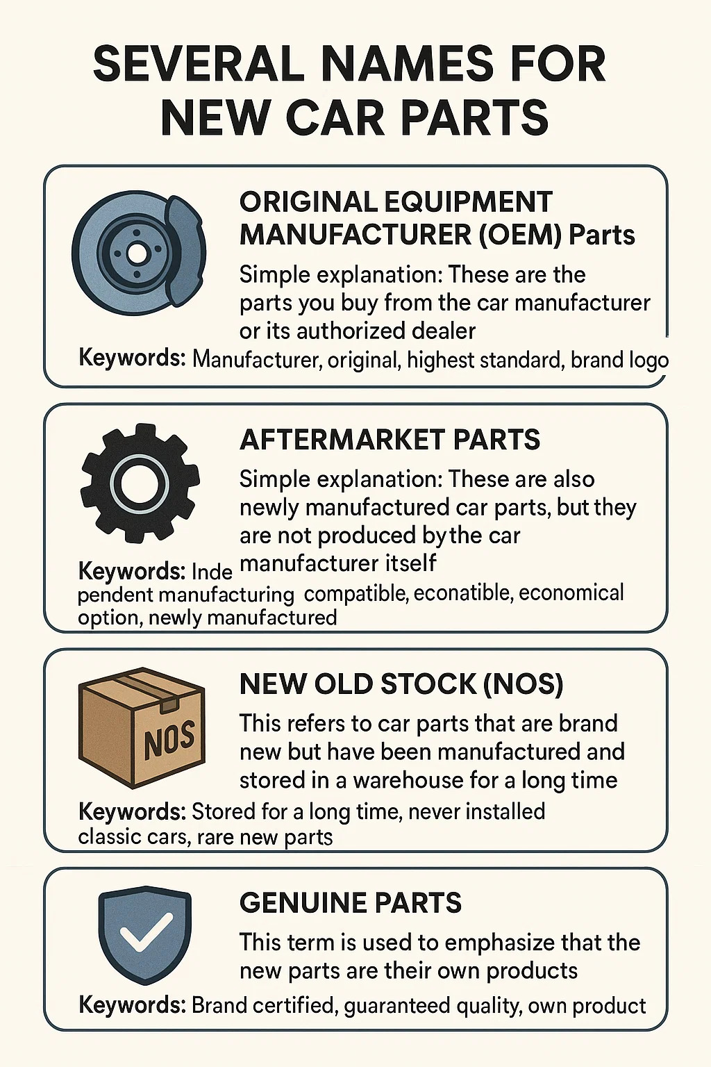 Basit açıklama: Bu terim genellikle üreticiler tarafından yeni parçaların kendi ürünleri olduğunu vurgulamak için kullanılır. Anlam olarak OEM parçalara çok benzediğini vurgulayarak bu otomobil parçalarının marka sertifikalı ve kalite garantili olduğunu vurguluyor.