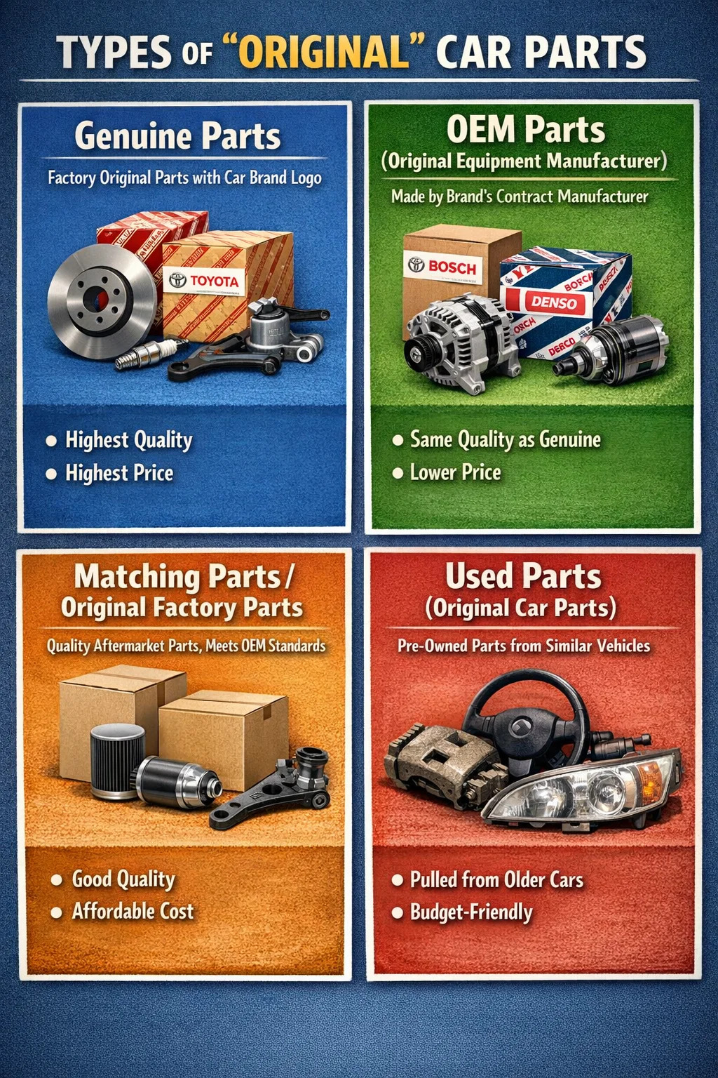 İnsanlar "orijinal" araba parçalarından bahsederken aslında kullanılan birkaç farklı terim vardır. Her ne kadar tamirci veya otomobil parçası mağazası sahiplerinin ağzına benzer gelse de, bu farklı operasyonlarda genellikle farklı fiyat noktalarını ve bunların kökenlerini temsil eder. otomobil parçaları .