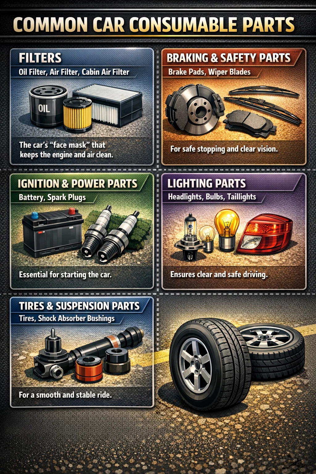 Basit açıklama: Lastikler en tipik sarf malzemesi araba parçalarıdır. Farklı araba modellerinin farklı lastik boyutları olmasına rağmen, genel lastik boyutları herhangi bir lastik mağazasında kolayca bulunabilir. Ek olarak, şasi üzerindeki bazı lastik burçlar (kauçuk takozlar olarak bilinir), yaşlanmaya ve çatlamaya eğilimli oldukları için tamir atölyelerinde yaygın olarak stoklanan parçalardır.