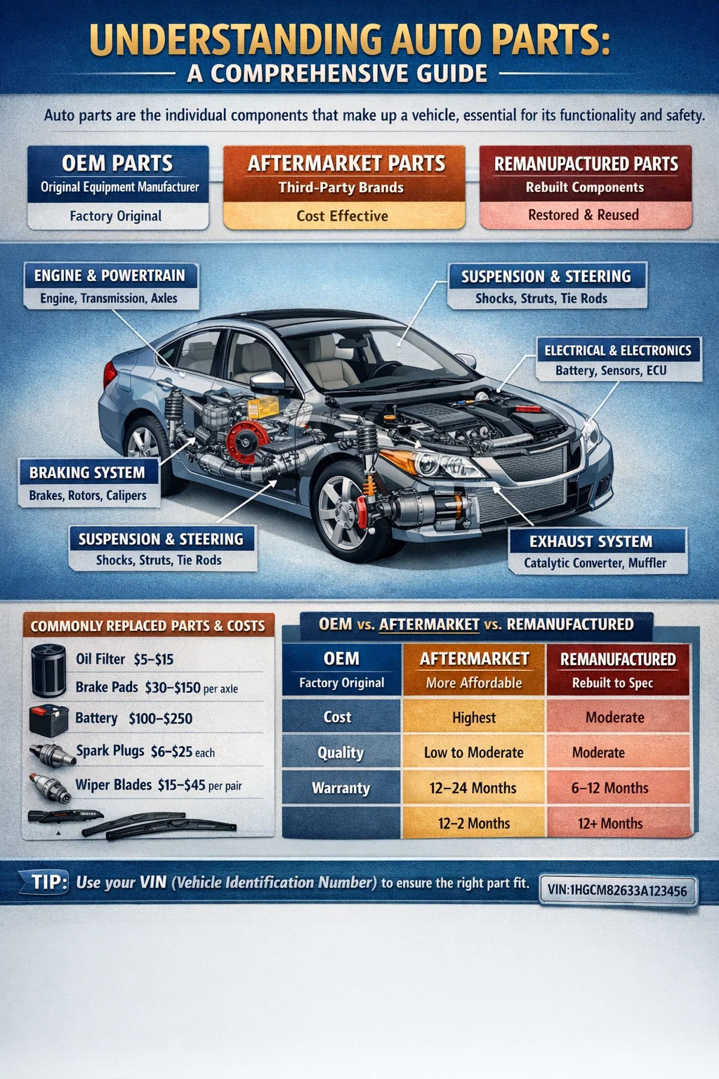Modern bir binek araçta 30.000 ile 40.000 arasında ayrı parça bulunur. Bu parçalar, her biri aracın çalışmasının farklı bir yönünden sorumlu olan sistemler halinde gruplandırılmıştır. Bu sistemleri anlamak, araç sahiplerinin tamircilerle daha net iletişim kurmasına, daha akıllı satın alma kararları vermesine ve bileşen aşınmasının erken uyarı işaretlerini fark etmesine yardımcı olur.
