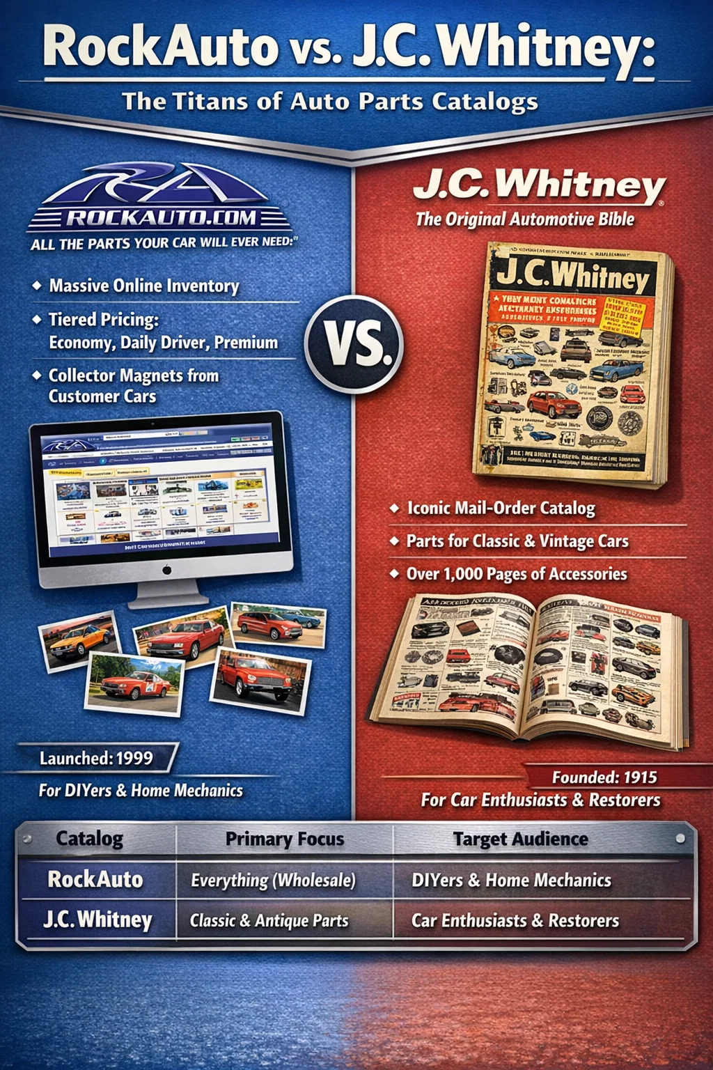 İnsanlar en ünlü otomobil parçaları kataloğunu sveyaduklarında sohbete iki isim hakim oluyor: RockOtomatik dijital çağ için ve J.C. Whitney tarihi önemi nedeniyle. RockAuto, neredeyse her şeyi kapsayan kapsamlı bir çevrimiçi veritabanı sunarak modern altın standart haline geldi. Otomobil parçası son birkaç on yılda üretilmiştir. Postayla sipariş edilen kağıt kataloglar çağını hatırlayanlar için J.C. Whitney, otomotiv DIY dünyasının "İncil'i" olarak bilinen tartışmasız kraldı.